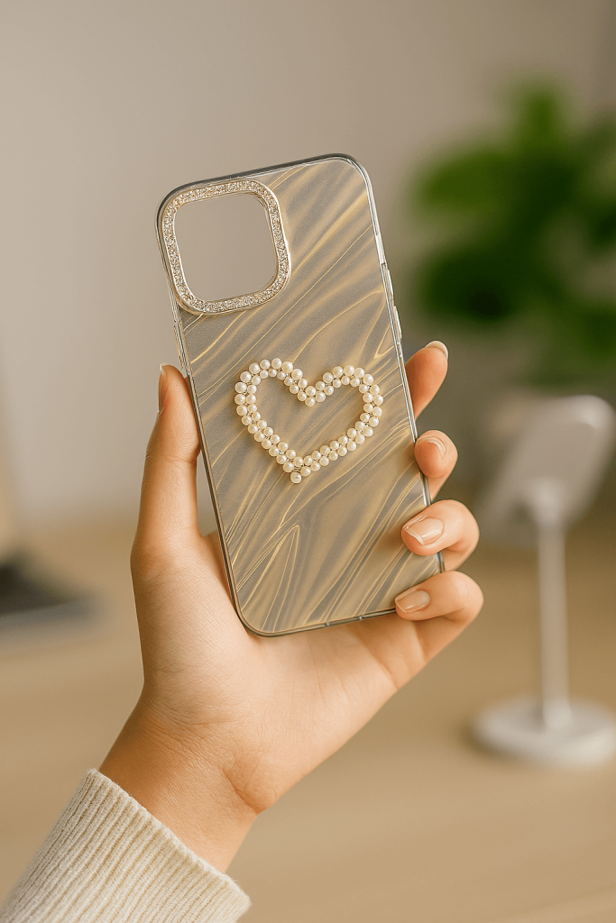 Crystal Blue Waves Pearl Heart Shine iPhone Case For Girls | Elegant Acrylic Back with 3D Pearl Heart Design